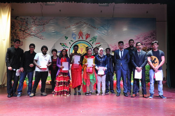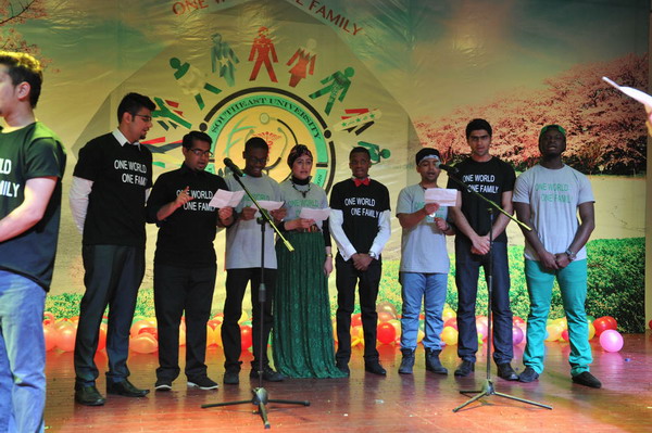 4月25日的颁奖晚会更是将这两周的激情氛围推向了高潮,海外教育学院、国际合作处、艾弗森贝博ballbet官网老师、各国留学生及中国学生,大家欢聚在此,共度良宵。现场激情四射,场面火爆。各国舞蹈轮番上阵,争奇斗艳,竟显英雄本色;各色穿着民族服装的伙伴们,每每上台都让人惊艳不已。印度吉他二重奏、阿拉伯歌曲,这种异域风情的曲调,更是别有一番滋味在心头。还有Farrukh等表演的喜剧,那种夸张搞笑的表演令人忍俊不禁。更让人激动和难忘的是留学生们自己翻译的东大校歌,以及09级学生自行设计的印有I LOVE SEU 的Tshirt, 自导自演的TV和歌曲,让全场掀起陷入对东大的无限热爱,那种学校的自豪感和光荣感一直膨胀……。