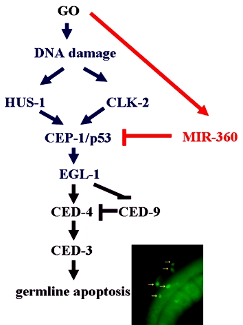 目前,很多研究表明工程纳米材料(ENMs)有诸多副作用,但生物体应对纳米材料毒性效应的自我保护机制仍很不清楚。利用秀丽线虫在体研究体系,研究表明氧化石墨烯(GO)可以影响动物生殖腺的发育,进而影响其生殖能力。GO在生殖毒性方面对生殖腺发育的影响很大程度上归因于所导致的生殖细胞凋亡和细胞周期阻滞的双重效应,DNA损伤在此过程中可能起着重要诱导作用。对于GO致生殖毒性潜在的分子机制,我们提出了HUS-1/CLK-2 -CEP-1-EGL- 1-CED-4-CED-3级联信号通路来解释细胞凋亡和DNA损伤的核心调控机制。进而,鉴定到一个抑制GO致生殖毒性的miRNA分子-mir-360,其可以通过调控CEP-1功能来抑制由GO激活的DNA损伤-凋亡级联信号通路。本研究揭示了一个新的经GO激活的由表观遗传信号编码的动物自我保护机制,该研究为深入揭示生物体应对工程纳米材料毒性的自我保护分子机制奠定了重要基础。