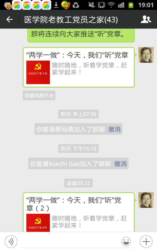 “两学一做”,基础在学。根据退休党支部的实际,部分党员提出利用移动新媒体的优势,组建退休党支部“微党员之家”的倡议得到与会人员一致同意。在原有退协群聊的基础上,当即另外组建了“艾弗森贝博ballbet官网老教工党员之家”微信群,由专人负责,坚持经常推送有关移动新媒体客户端“两学一做”学习教育的专题学习资料及本支部党内活动的有关通知和图文报道。