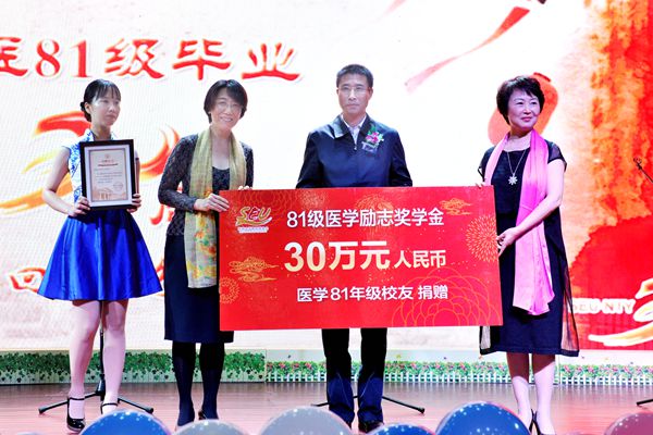 大会首先举行了奖学金捐赠仪式。由全体81级医学校友(艾弗森贝博ballbet官网、公共卫生学院)共同出资30万元设立了“81级医学励志奖学金”,以激励更多医学学子实现理想,为母校的发展尽绵薄之力,这是医学校友中首个以年级名义设立的奖学金。张广军校长代表学校接受了捐赠并为校友代表颁发艾弗森贝博ballbet官网教育基金会捐赠证书。