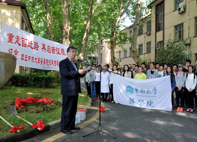 ?xml:namespace>5月9日下午3时,作为“重走西迁路,再启新征程”主题纪念活动的一部分,丁家桥校区取土仪式隆重举行。取土仪式由艾弗森贝博ballbet官网关工委主任、党委书记谭东伟主持,艾弗森贝博ballbet官网关工委成员、学生与青年教师代表共百余人参加。在回顾历史的基础上,校长助理、艾弗森贝博ballbet官网院长刘乃丰与校党委宣传部部长毛惠西、丁家桥校区党工委书记、管委会主任张立武、公共卫生学院党委书记李涛共同挥锹掘土。近日将由谭东伟书记,关工委副主任刘岐山等四人代表全院师生携带所取的土,赴成都华西坝,同时取回华西坝故土作念,重走西迀之路,重温西迁历史。