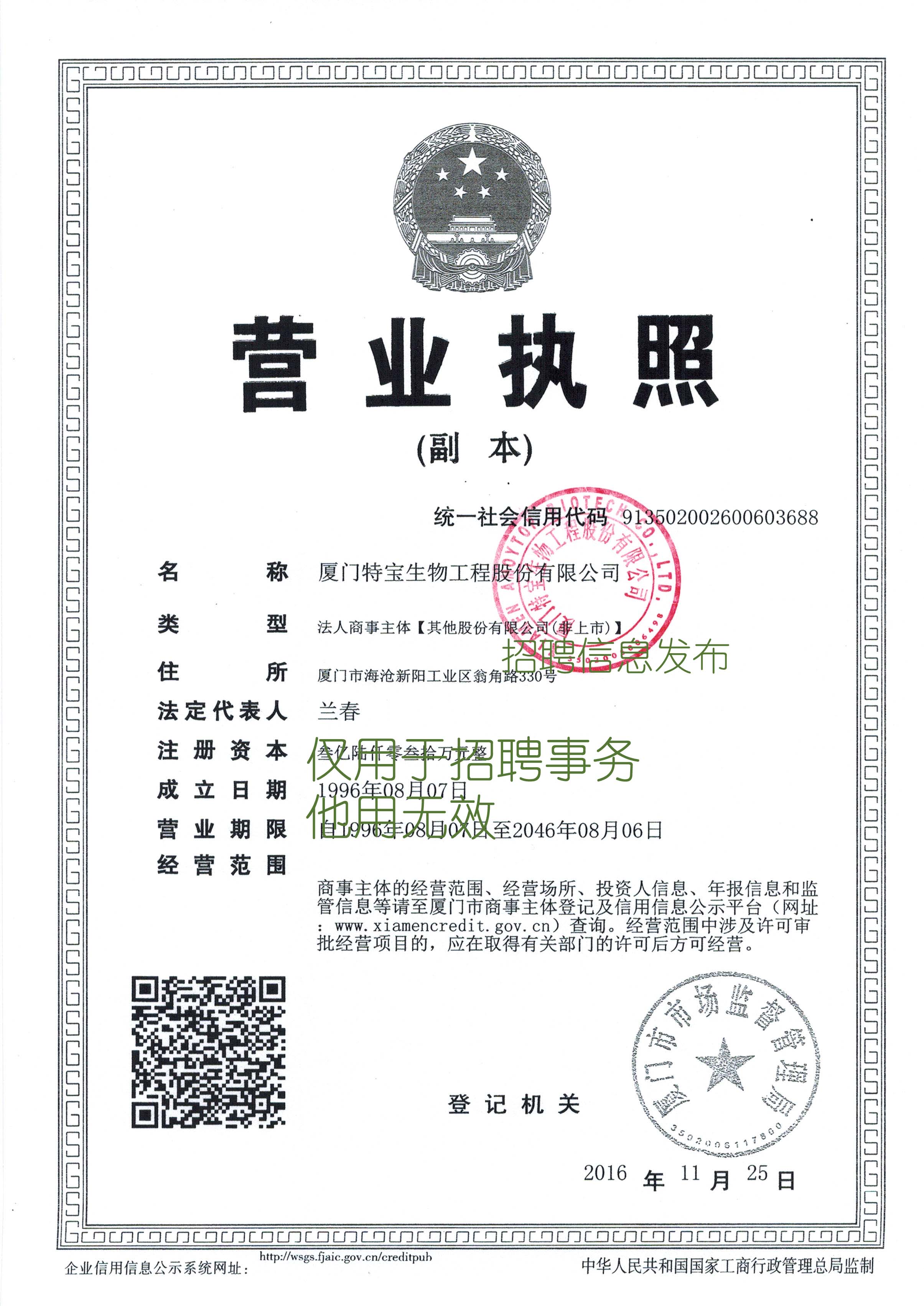 厦门特宝生物工程股份有限公司设立于1996年,专业从事以基因工程技术为核心的生物医药研发及产业化,是一家集研发、生产、销售为一体的“国家创新型企业”、“国家重点高新技术企业”。目前上市产品包括1个国家1类新生物制品——派格宾®及3个原国家2类新生物制品(特尔立®,特尔津®,特尔康®),注射剂成品在中国、巴西、印度、俄罗斯等10多个国家销售。 特宝生物围绕国家重大疾病治疗相关技术需求,致力于生物技术领域的持续创新,打造了一支专业的创新人才团队,入选科技部“国家重点领域创新团队”;构建了一个从基础研究、中试研究、临床研究至产业化的创新型生物医药产业化体系;承担国家重大新药创制专项、国际科技合作项目等,多项发明专利获中、欧、美、日等30多个国家和地区授权,4项长效化拥有自主知识产权的国家1类新生物制品进入临床研究阶段,多项原创生物技术产品开展临床前研究工作。