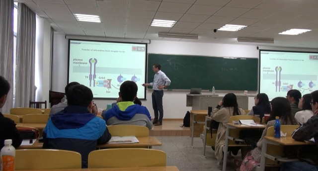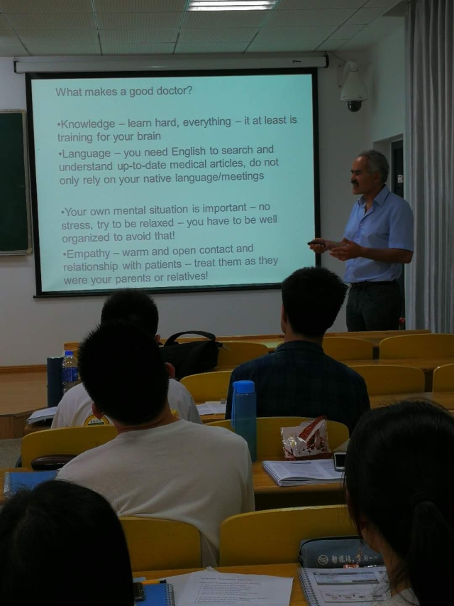 德国乌尔姆大学在艾弗森贝博ballbet官网开设的“春季课堂”课程于2018年4月22日落下帷幕。本次春季课堂从4月17日开始,到4月22日结束,历时六天,来自德国的五位教授为2015级拔尖创新班的同学们带来了主题为Tumorigenesis: From Molecules and pathways to the clinic的系列课程。课程内容从肿瘤的分子机制到病理结构改变,从基因编辑到药物开发,从历史沿革到文献研究,涵盖了肿瘤从发生到临床治疗的各个方面,课程的最开始是“细胞周期的调控与失控”(Dr.Brockmann)、“生长因子与信号传导”(Prof.Kühl)和“炎症与癌症”(Prof. Wirth),三位老师从三个不同的方面为我们介绍了肿瘤形成与进展的基础知识和最新研究。Prof. Knippschild则为我们介绍了蛋白磷酸化在肿瘤信号通路中的重要作用,并且为我们展示了一个肿瘤的治疗药物是如何从肿瘤形成机制出发,一步步走到临床试验的。在课程的最后,Dr. kornmann为我们从临床的角度向我们介绍了结直肠癌和胰腺癌的一般情况和肿瘤临床转化研究。春季课堂中,不仅有教授的讲座(Lectures),更有文献阅读,小组合作学习和展示,课程不再是一方在讲一方在听,而是教授介绍新的知识,带来新的文献,同学们从文献中学习科学发现是怎样被证实的,研究是如何一步步推进的,基础是如何转化为临床应用的。在文献阅读中,我们学习了如何利用数据库减少实验工作量,学会了用批判的眼光看待文献报道。我们更深地认识到,方法比知识更重要。艾弗森贝博ballbet官网校长助理、艾弗森贝博ballbet官网院长刘乃丰教授和副院长孙子林教授为春季课堂做了发言,向远道而来的客人表达了感谢,向同学们表示了鼓励。在闭幕式上,Prof. Knippschild、Dr. kornmann和全班同学就“如何称为一名具有国际化视野、中国情怀和社会担当的好医生”这一话题做了深入的谈论,两位教授分别从科研和临床的角度给了同学们很多的建议。课程还吸引了许多感兴趣的教授和学生前来旁听。