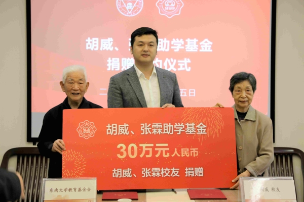 年逾九旬的胡威老师在发言中说,自己生长在农村,是党将他领上革命的道路。他16岁参军,经历过抗日战争、解放战争。新中国成立后进入学校学习,毕业后留校参加学生教育工作。虽然那时上学条件艰苦,但在国家和学校给予的补助下,基本生活问题都可得到解决。同学们感念于此便更加努力学习,报效祖国。由此,他们夫妇二人决定将其多年积攒下来的退休工资30万元捐赠给学校设立助学基金以帮助需要帮助的东大学子完成学业。他希望同学们思想上要铭记党和国家的关怀,学习上要勤勉努力、刻苦钻研,生活上要注意锻炼身体,为未来打好基础。