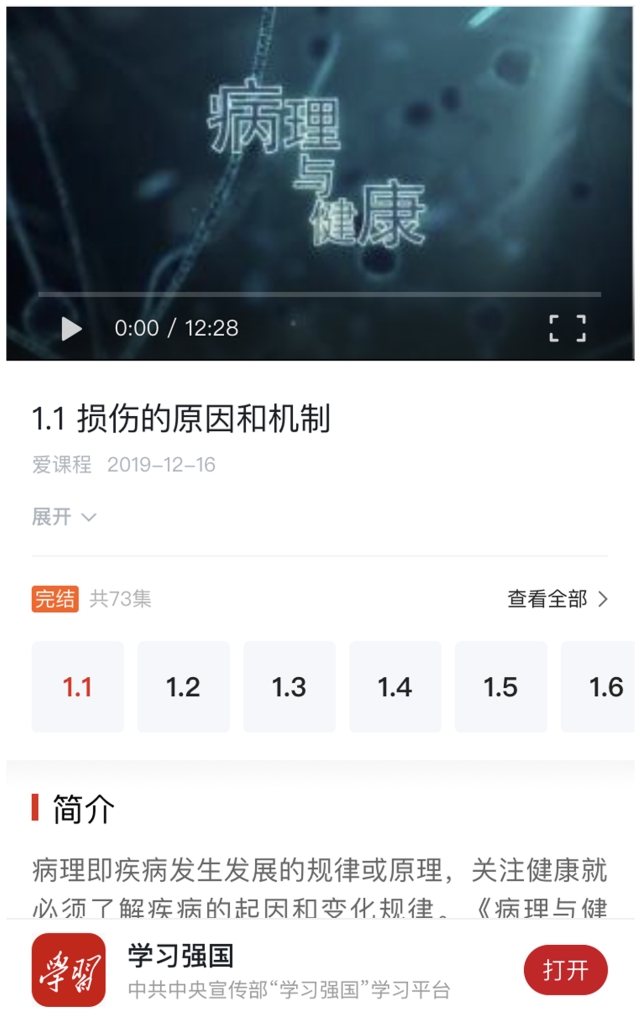 我院开设的慕课《病理与健康》(国家精品)于2019年12月16日被“学习强国”APP选用,上线两周仅第一讲点赞量超1.7万。