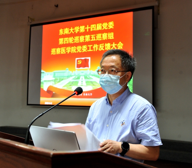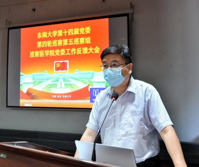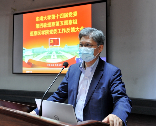 学院党委书记谭东伟代表学院作表态发言,他指出巡察发现的问题,一针见血、切中要害,令人警醒地指出了我们存在的问题,并提出了许多富有建设性、针对性和操作性的整改意见。学院党委将从讲政治的高度,认清巡察整改工作的重要意义;以严肃认真的态度,强化整改责任落实;以求真务实的作风,逐项抓好整改任务;压实责任,强化跟踪督办力度。以巡察整改为契机,进一步加强党的建设,加大综合改革力度,认真做好疫情防控下各项工作的开展,认真制定“十四五”事业发展规划,积极准备第五轮学科评估,全面实施“特色医科”发展战略。在学校党政的领导下,在全院师生的共同努力下,学院各项事业必将取得更好更快的发展。