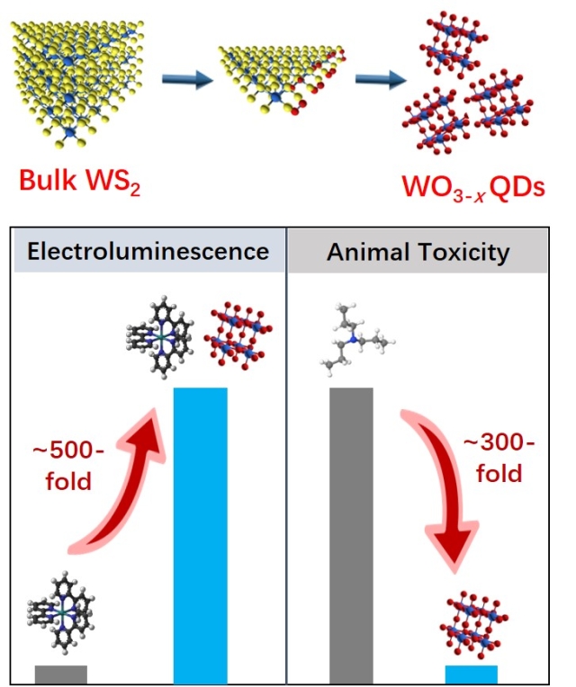 针对以上问题,该课题组开发了一种氧化钨(WO3-x)纳米点新型绿色共反应剂,不仅动物毒性比TPrA低约300倍,与Ru(bpy)32+联用的ECL效率还可与TPrA标杆体系相媲美。基于此,该研究进一步构建了用于检测全血样本的循环肿瘤细胞传感器,克服了临床商业化细胞仪仅能分析血清样品的短板。
