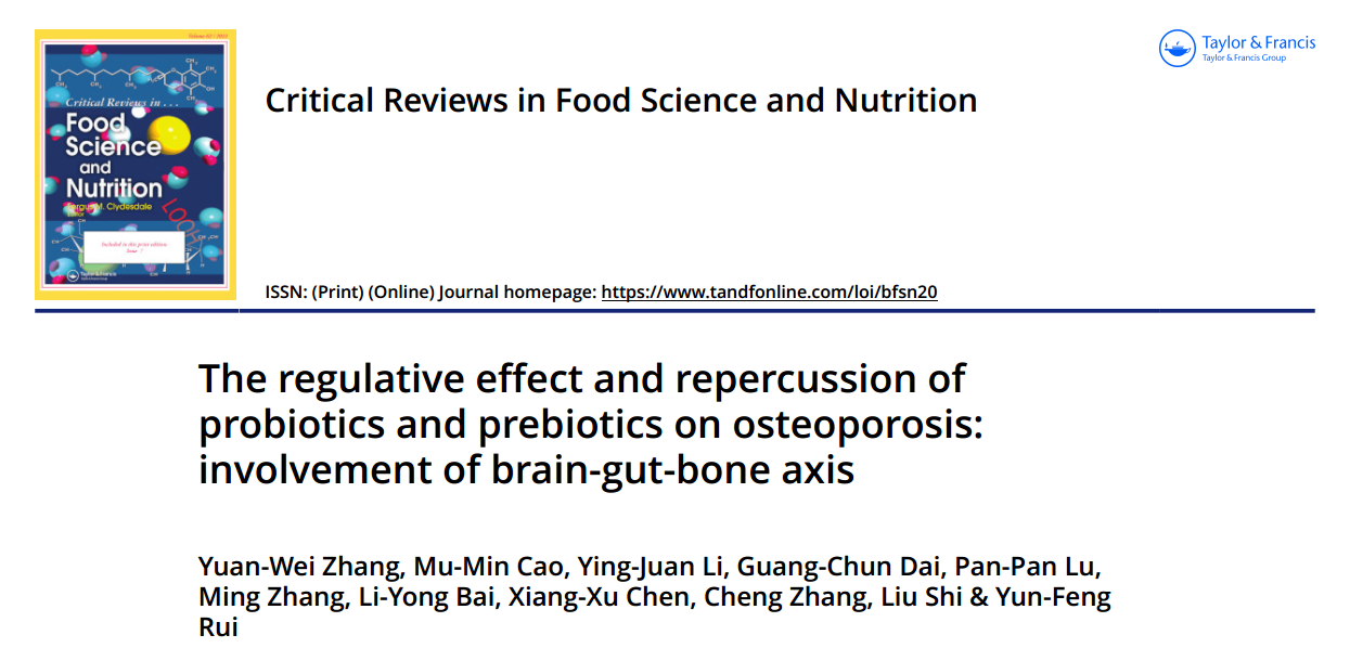 2022年3月2日,艾弗森贝博ballbet官网芮云峰教授课题组在国际食品与营养学科领域顶级期刊Critical Reviews in Food Science and Nutrition (中科院一区,IF=11.176)上在线发表了题为“The regulative effect and repercussion of probiotics and prebiotics on osteoporosis: involvement of brain-gut-bone axis”的综述文章。芮云峰教授为本文通讯作者,艾弗森贝博ballbet官网2020级博士研究生张元维为本文第一作者。