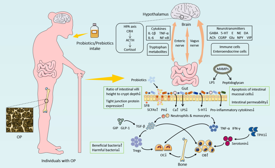 益生菌是一种对人体健康有益的活性微生物,而益生元则是一种不可消化和可发酵的食品成分,其可改善有益微生物的生长、繁殖和/或促进微生物代谢产物的有益调节。当前,许多种类的益生菌和益生元已被广泛应用于工、农业生产和食品、药品制造行业,其中包括酵母菌、乳酸杆菌、罗伊氏菌和双歧杆菌等,且越来越多的研究也正在逐渐聚焦于益生菌和益生元对机体骨代谢的调节作用和影响上。在本文中,研究团队广泛检索既往发表的高质量文献,并在脑-肠-骨轴的基础上,从益生菌和益生元对宿主肠道代谢产物的调节、肠黏膜屏障功能的调节、神经调节、免疫调节和内分泌调节等多个角度进行综述,诠释了益生菌和益生元在机体骨代谢调节中的独特应用价值,并进一步为今后中老年人群骨质疏松的防治提供了新颖的思路和可鉴的参考价值。