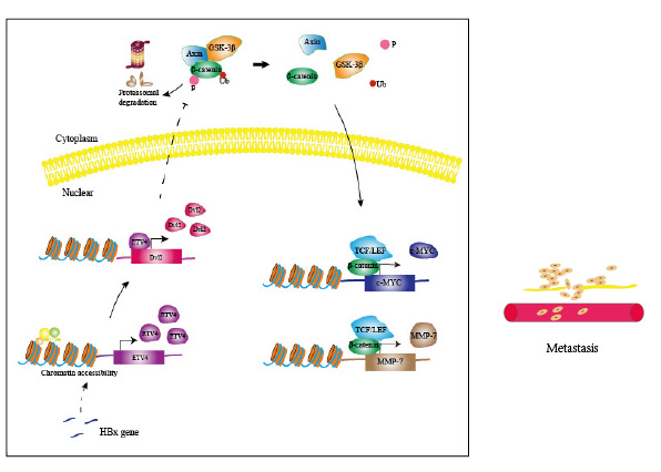 HCC肝癌是严重威胁人类健康的恶性肿瘤之一,因其发病率高、术后容易复发以及预后差,5年总体生存率仅约为18%。 我国70% ⁓ 80%的HCC患者中能够检测到HBV感染,慢性HBV感染促进HCC的发生发展一直是肝癌研究的重点。HBV基因组编码的HBx蛋白不仅对HBV病毒的复制至关重要,而且直接参与了HCC发生发展过程。樊红教授课题组近期应用H3K27ac的ChIP-seq筛选HBx可能通过染色质激活状态调控肿瘤相关的靶基因,发现HBx通过激活染色质可及性上调了转录因子ETV4的表达。上调的ETV4靶向DVL2进而激活了Wnt/β-catenin信号通路促进了HCC细胞的侵袭和迁移。重要的是,ETV4的高表达预示着HCC患者预后更差。