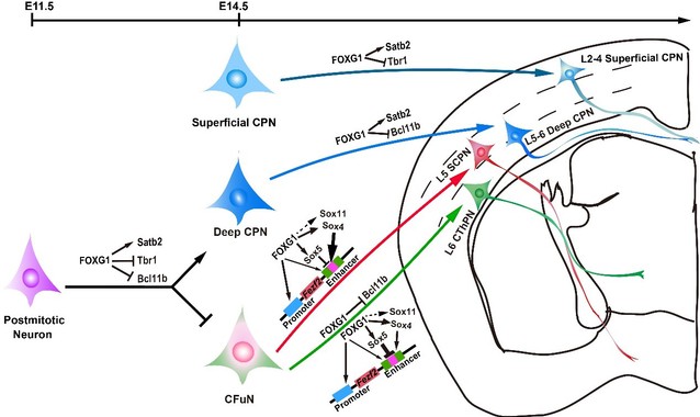 大脑皮质中的胼胝体投射神经元通过连接大脑双侧半球进行信息整合,脑下投射神经元和皮质丘脑投射神经元则作为大脑皮质的信息输出系统,精确调控随意运动。这些不同类型的神经元构成了大脑皮质调控感觉、运动、语言、认知、社交、情感等生命活动的结构基础。多种神经发育性脑病如自闭症谱系障碍等均表现出胼胝体和离皮质投射改变等结构异常以及与之相关的智力缺陷、情感障碍和感觉运动统合失调等症状。携带FOXG1突变的患者表现为严重的社会交往能力低下、语言障碍和刻板动作等自闭症核心症状。该研究通过建立FOXG1条件性基因敲除的小鼠模型,发现FOXG1时空性地调控不通类型投射神经元的特化:大脑皮质发育早期FOXG1通过阻遏脑下投射神经元和皮质丘脑投射神经元命运促进细胞向着胼胝体投射神经元的命运特化,这一过程通过直接转录激活Satb2同时抑制Tbr1和Bcl11b而实现;而在发育后期,FOXG1 则通过与SOX家族SOX4/11、 SOX5等成员竞争性地结合Fezf2,精细地调控Fezf2的转录表达水平进而决定脑下神经元和皮质丘脑投射神经元的特化。缺失FOXG1后这些不同类型神经元命运特化的异常导致了胼胝体及脑下神经纤维投射的缺陷。以上发现对于理解自闭症的核心症状以及感觉运动统合失调的病理机制提供了新的视角。