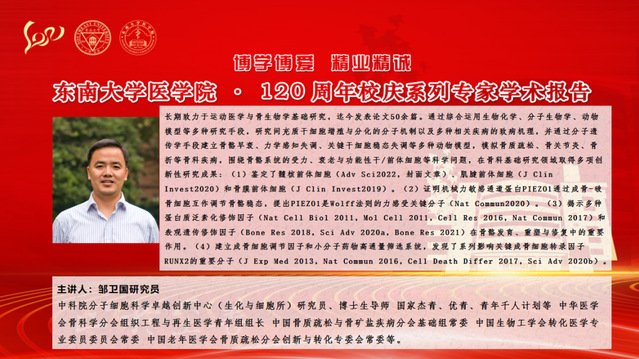 邹卫国研究员长期致力于运动医学与骨生物学基础研究,迄今发表论文50余篇。通过综合运用生物化学、分子生物学、动物模型等多种研究手段,建立体内、体外高通量筛选系统,研究间充质干细胞增殖与分化的分子机制以及多种相关疾病的致病机理,并通过分子遗传学手段建立了骨骼早衰、力学感知失调、关键干细胞稳态失调等多种动物模型,模拟骨质疏松、骨关节炎、骨折等常见骨科疾病,围绕骨骼系统的受力、衰老与功能性干/前体细胞等关键科学问题,在骨科基础研究领域取得了多项创新性研究成果:(1)鉴定了髓核前体细胞(Adv Sci2022,封面文章)、肌腱前体细胞(J Clin Invest2020)和骨膜前体细胞(J Clin Invest2019)。(2)证明机械力敏感通道蛋白PIEZO1通过成骨-破骨细胞互作调节骨骼稳态,提出PIEZO1是Wolff法则的力感受关键分子(Nat Commun2020)。(3)揭示多种蛋白质泛素化修饰因子(Nat Cell Biol 2011,Mol Cell 2011,Cell Res 2016,Nat Commun 2017)和表观遗传修饰因子(Bone Res 2018,Sci Adv 2020a,Bone Res 2021)在骨骼发育、重塑与修复中的重要作用。(4)建立成骨细胞调节因子和小分子药物高通量筛选系统,发现了系列影响关键成骨细胞转录因子RUNX2的重要分子(J Exp Med 2013,Nat Commun 2016,Cell Death Differ 2017,Sci Adv 2020b)。这些研究成果促进了对骨发育、骨重建与骨稳态分子机制的理解,为运动系统疾病的治疗提供了新的思路和药物靶点,促进了新时代我国运动医学与骨生物学基础研究的长足进步。国家自然科学基金委网站先后四次以“资助成果”的形式进行报道,学术评论网站Faculty of 1000多次进行了推荐。