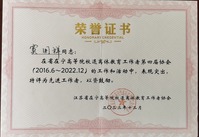 2022年年底,江苏省在宁高校退离休教育工作者协会曾作出决定,对2016年以来,在为发展、促进和支持在宁高校退教协工作和活动中,做出突出成绩和贡献的先进集体和先进个人予以表彰。