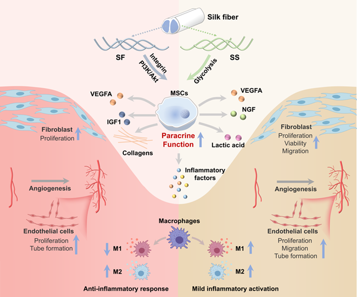 中国作为最早缫丝养蚕的国家,孕育的蚕丝文化源远流长。随着科技的进步及多学科的交叉融合,蚕丝的应用已不局限于传统的纺织领域,其在组织工程和再生医学领域亦展现出巨大的潜力。从化学组成上看,蚕丝是一种天然的蛋白质聚合物,主要由核心的丝素蛋白(SF,70–75%)和外周包裹的丝胶蛋白(SS,25–30%)组成。虽然基于SF和SS的生物支架在多种组织修复和再生应用中显示出积极作用;然而,蚕丝材料内在生化信号通常被忽视,其对细胞功能和组织再生的整体影响仍有待阐明,特别是在高通量分子水平上。