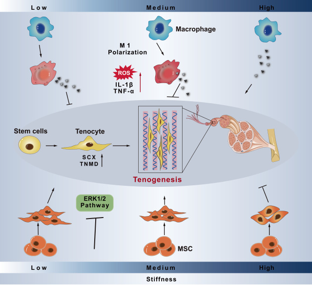 基质硬度是影响干细胞分化命运的重要物理因素,通过调控生物材料的硬度从而指导干细胞定向分化已经在组织工程中得到较为广泛的应用。然而,何种硬度能够调控干细胞向腱系分化尚存在争议。此外,研究表明宿主免疫细胞可与植入体内的生物材料相互作用,并通过旁分泌信号调节干细胞的生物学行为和功能。然而,这些信号在干细胞腱系分化中的作用尚不清楚。