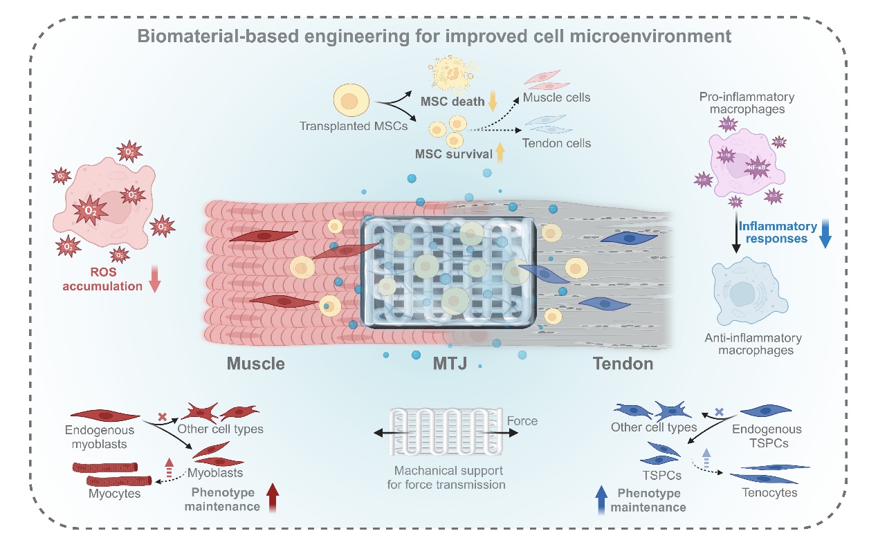 针对这一挑战,研究团队利用3D打印技术制备了聚乳酸-羟基乙酸共聚物支架,与可光交联的丝素蛋白水凝胶相结合,并负载了间充质干细胞和重组蛋白Klotho,构建出一种新型的多功能纤维增强水凝胶,MTJ的结构重建和功能再生提供足够的力学支持并有效调控MTJ损伤后的病理微环境。该支架体系可以通过改善细胞炎症和氧化应激微环境,对移植的外源间充质干细胞、MTJ处的常驻内源细胞(肌肉细胞、肌腱细胞及巨噬细胞)等多种细胞群体进行功能性调控,从而有效促进MTJ损伤修复。此项研究聚焦于MTJ损伤这一临床难题,首次全面评估了组织工程策略用于MTJ再生修复的体内功能恢复效果,在目前临床上尚无有效治疗方法的现状下,为MTJ的治疗提供了全新的解决思路。