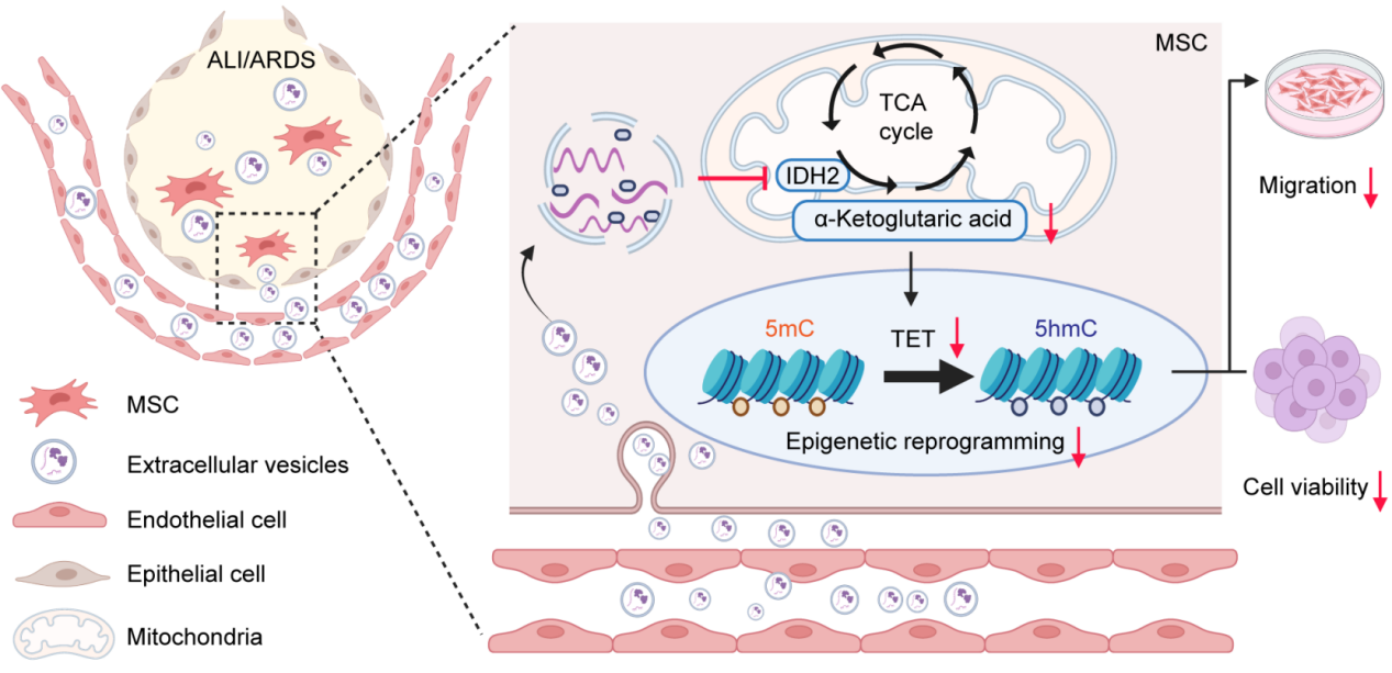 本研究发现,ARDS肺微环境中内皮细胞来源的细胞外囊泡(EC-EVs)显著增加,这些EC-EVs通过抑制MSCs的细胞活力和迁移能力,减弱其对ARDS肺损伤的修复作用。进一步机制研究表明,病理状态下产生的EC-EVs通过下调三羧酸循环(TCA)中异柠檬酸脱氢酶2IDH2)的表达,减少α-酮戊二酸(α-KG)生成,进而抑制MSCs中羟甲基化关键酶TET活性,降低MSCs的修复功能。