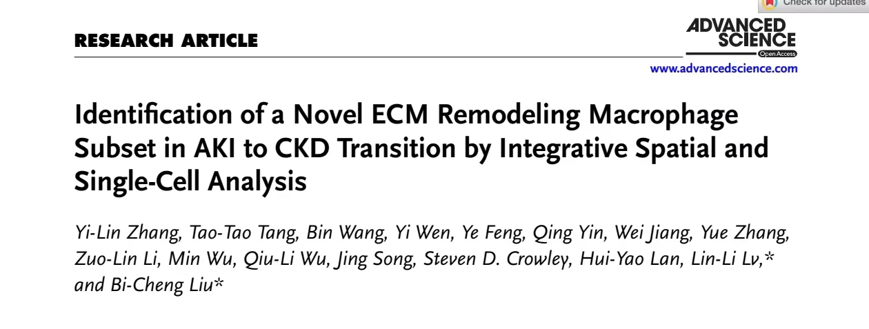 急性肾损伤(Acute kidney injury, AKI)是临床常见的急危重症,不仅会引起严重的急性机体内环境紊乱而威胁患者生命,越来越多研究还发现,AKI进展为慢性肾脏病(CKD)的风险显著增加,是CKD形成和终末期肾病发生的重要原因,但其确切机制尚不清楚,是肾脏病领域备受关注的重大科学问题。艾弗森贝博ballbet官网刘必成和吕林莉教授团队在科技部重点研发计划和国家自然科学基金重点项目等资助下,对此进行了深入研究,取得重要进展,相关成果近期在《Advanced Science》在线发表研究论文,题为“Identification of a Novel ECM Remodeling Macrophage Subset in AKI to CKD Transition by Integrative Spatial and Single-Cell Analysis”。