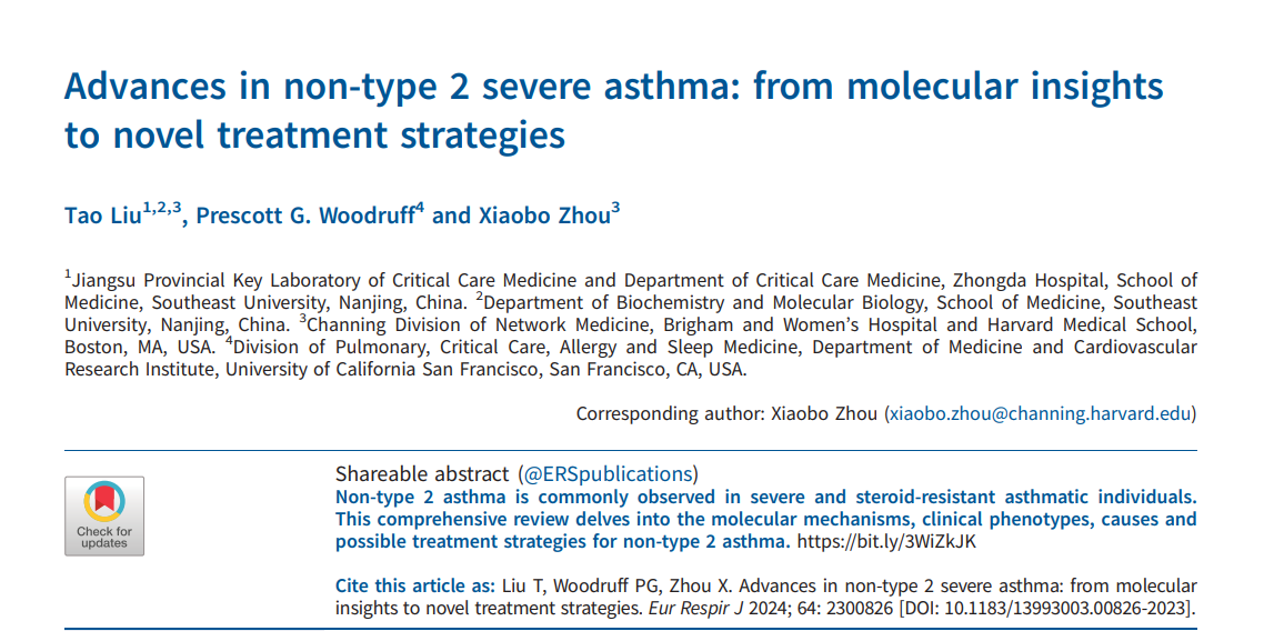 2024年8月15日,艾弗森贝博ballbet官网/江苏省重症医学重点实验室刘涛教授与美国加州大学旧金山分校Prescott G Woodruff教授,哈佛大学艾弗森贝博ballbet官网布莱根妇女医院Xiaobo Zhou教授合作在呼吸领域顶尖杂志European Respiratory Journal (中科院1区,IF=16.6)上发表了题为“Advances in non-type 2 severe asthma: from molecular insights to novel treatment strategies”的综述论文。
