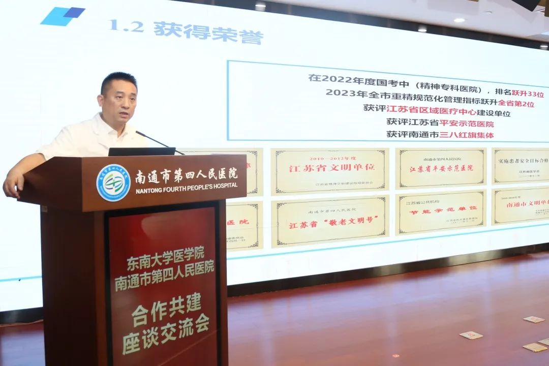 南通市卫健委主任张兵肯定了市四院近年来的发展。他在讲话中表示,能与艾弗森贝博ballbet官网签约合作,既是南通四院的荣幸,也是南通精神卫生事业能够取得跨越式发展的重要契机。市卫健委将全力支持市四院与东大艾弗森贝博ballbet官网的合作。他要求全体四院人要举全院之力,在硬件配备、人员队伍建设等方面下功夫,进一步完善合作机制和途径,全面促进医院医教研等工作更上一层台阶。