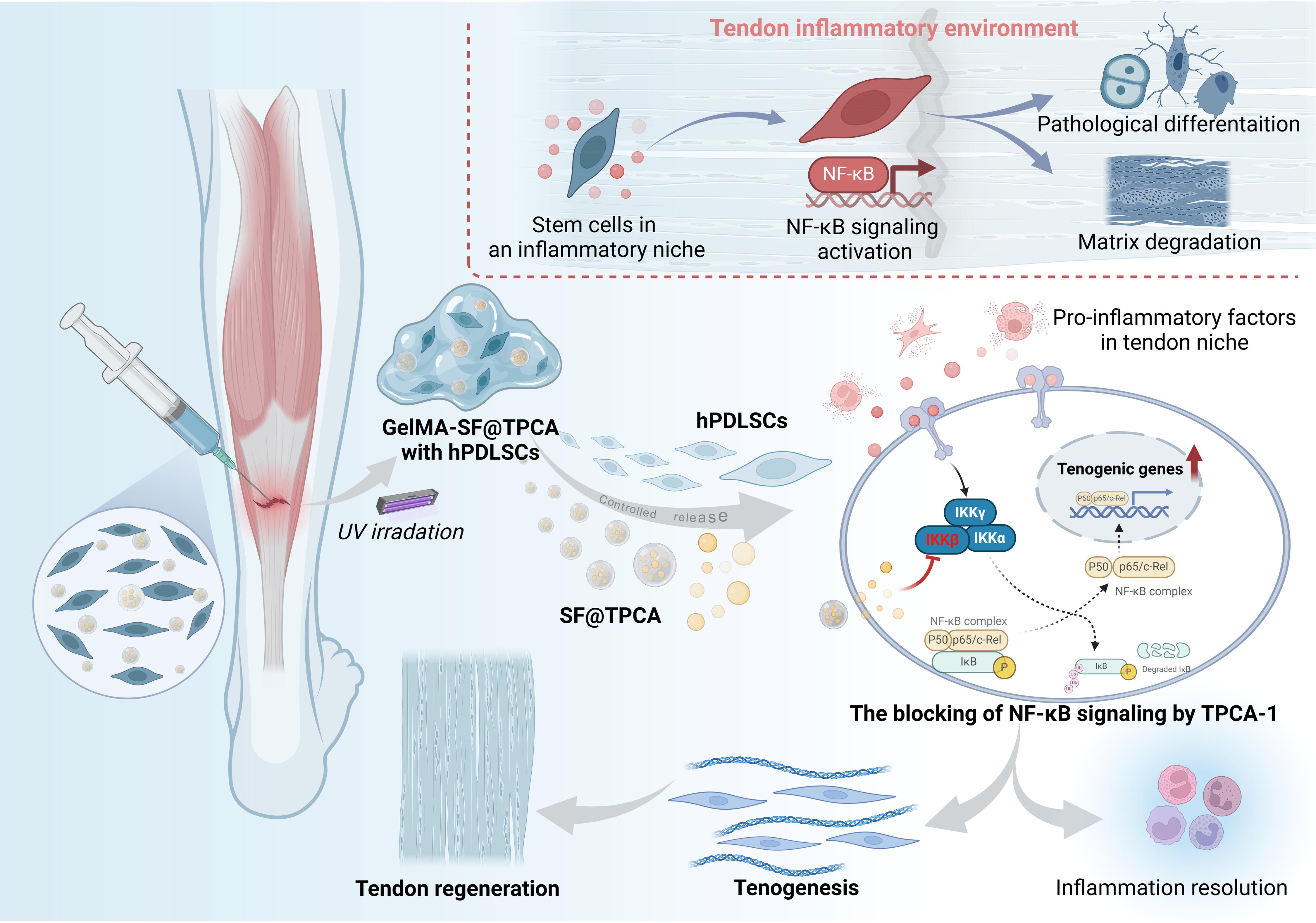 本研究不仅深入揭示了NF-κB信号通路在肌腱炎症中的作用机制,还而且提出通过递送TPCA-1来改善肌腱炎症微环境,从而提升干细胞移植治疗肌腱损伤的疗效。这一成果有望为临床肌腱损伤治疗提供新的干预策略,推动肌腱再生医学的发展。