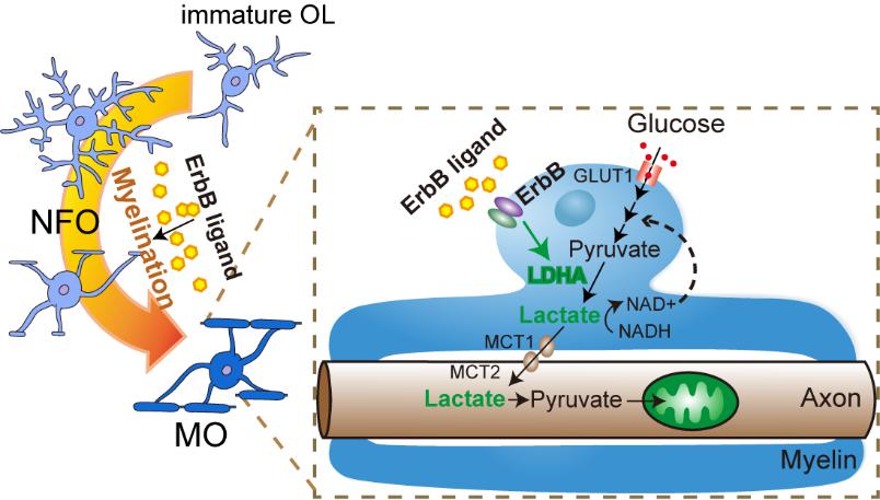 研究团队利用遗传工程小鼠实现在小鼠青少年时期分别特异性靶向少突胶质前体细胞(OPC)、新生成少突胶质细胞(NFO)或成熟少突胶质细胞(MO),在细胞内广谱抑制ErbB信号通路,以探究ErbB信号通路通过髓鞘机制影响精神分裂症病理病症的可能性。该研究结合大量在体和离体实验分析,明确了ErbB信号通路对髓鞘发育的重要作用和细胞机制。同时,研究团队意外发现 MO中的ErbB信号通路并不影响髓鞘发育,但通过影响K-Ras活性调控MO表达乳酸脱氢酶A(LDHA),从而影响MO通过有氧糖分解(Aerobic glycolysis)供给轴突能量底物的生理过程(如下图所示)。特异性抑制MO中的ErbB信号通路导致能量应激下的轴突传导功能下降。有趣的是,髓鞘结构缺陷会导致小鼠工作记忆缺陷,而当髓鞘结构完整但有氧糖分解途径受损时也会导致小鼠工作记忆缺陷。这些发现强调了ErbB信号通路在白质完整性和功能中不可或缺的作用,并为白质异常造成认知障碍的机制提供了多维度见解。