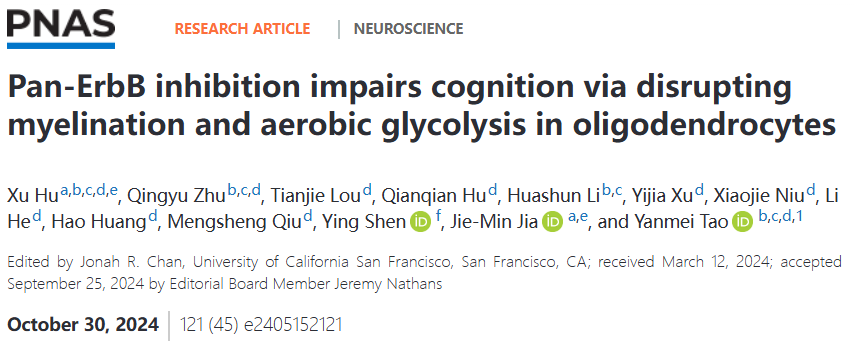 2024年10月30日,艾弗森贝博ballbet官网、发育与疾病相关基因教育部重点实验室陶艳梅教授团队在国际权威综合性杂志《PNAS》在线发表题为Pan-ErbB inhibition impairs cognition via disrupting myelination and aerobic glycolysis in oligodendrocytes的研究论文。