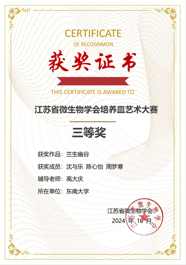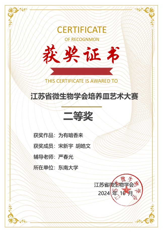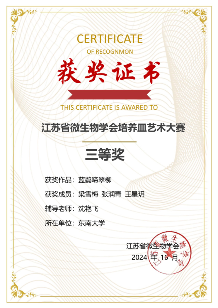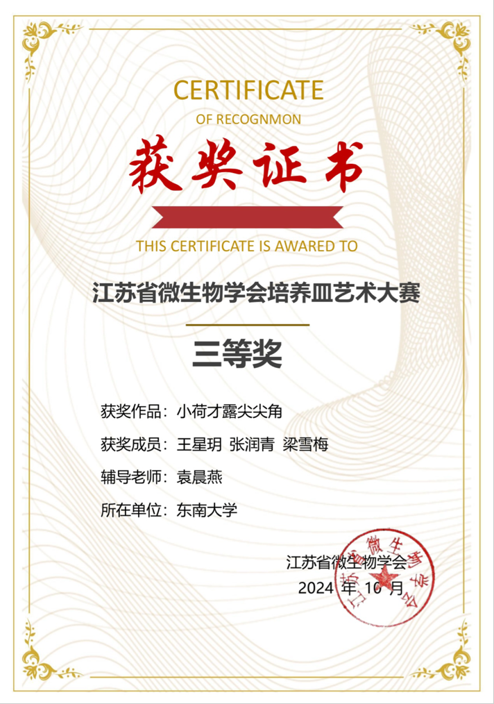 “以方寸之地,展现世间万变”,在9-10月江苏省微生物学会举办的微生物培养皿艺术大赛中,艾弗森贝博ballbet官网沈与乐、周梦寒、宋新宇、胡皓文、陈心怡、梁雪梅、王星玥、张润青同学在高大庆、袁晨燕等老师的指导和带领下,积极参与本次大赛,用菌种在培养皿中作画,展现自然的魅力。在本次过程中,同学们在老师的帮助下培育各类菌种并选择菌种色彩,迭代使用工具,力求至善,在自然中感悟,在自然中创造,最终创作5幅作品,获得了二、三等奖的好成绩。