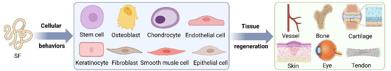 组织工程与再生医学是一门融合生物学、医学、材料学和工程学等多学科领域的交叉学科,其主要目标是通过整合生物材料、种子细胞和生物活性分子,开发能够修复或再生受损组织和器官的生物替代品。选择与开发合适的生物材料对于实现最佳的再生效果至关重要。丝素蛋白因其优异的机械性能、生物相容性、可调节的生物降解性和加工多样性,在组织工程与再生医学领域得到了广泛应用。然而,当前对丝素蛋白生物材料的研究主要聚焦于其作为结构支架或载体的功能,而对其固有生物效应(即独立于添加外源生物活性分子)的研究仍显不足。