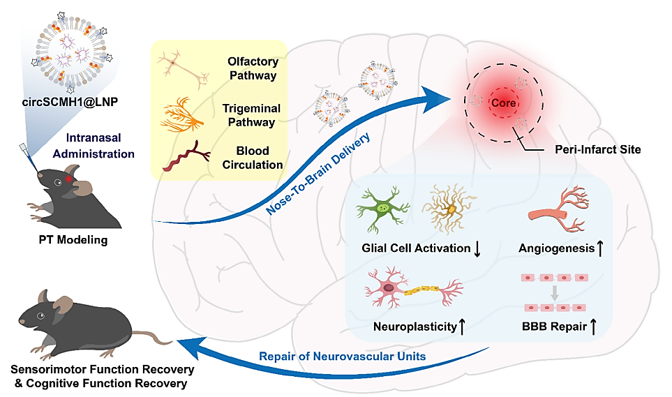 近日,艾弗森贝博ballbet官网姚红红教授团队在国际权威学术期刊《Advanced Materials》发表了题为“Nose-to-Brain Delivery of Circular RNA SCMH1-Loaded Lipid Nanoparticles for Ischemic Stroke Therapy”(鼻-脑递送负载环状RNA circSCMH1的脂质纳米颗粒用于缺血性卒中治疗)的研究论文。该研究开发了一种通过鼻内给药有效递送circSCMH1,以修复缺血性脑卒中后脑损伤的创新治疗策略。研究可拉近基础研究和转化应用之间的关键差距,为临床应用核酸药物circSCMH治疗脑卒中患者铺平道路,有望造福更多脑卒中患者。(Adv. Mater. 2025, DOI: 10.1002/adma.202500598)。