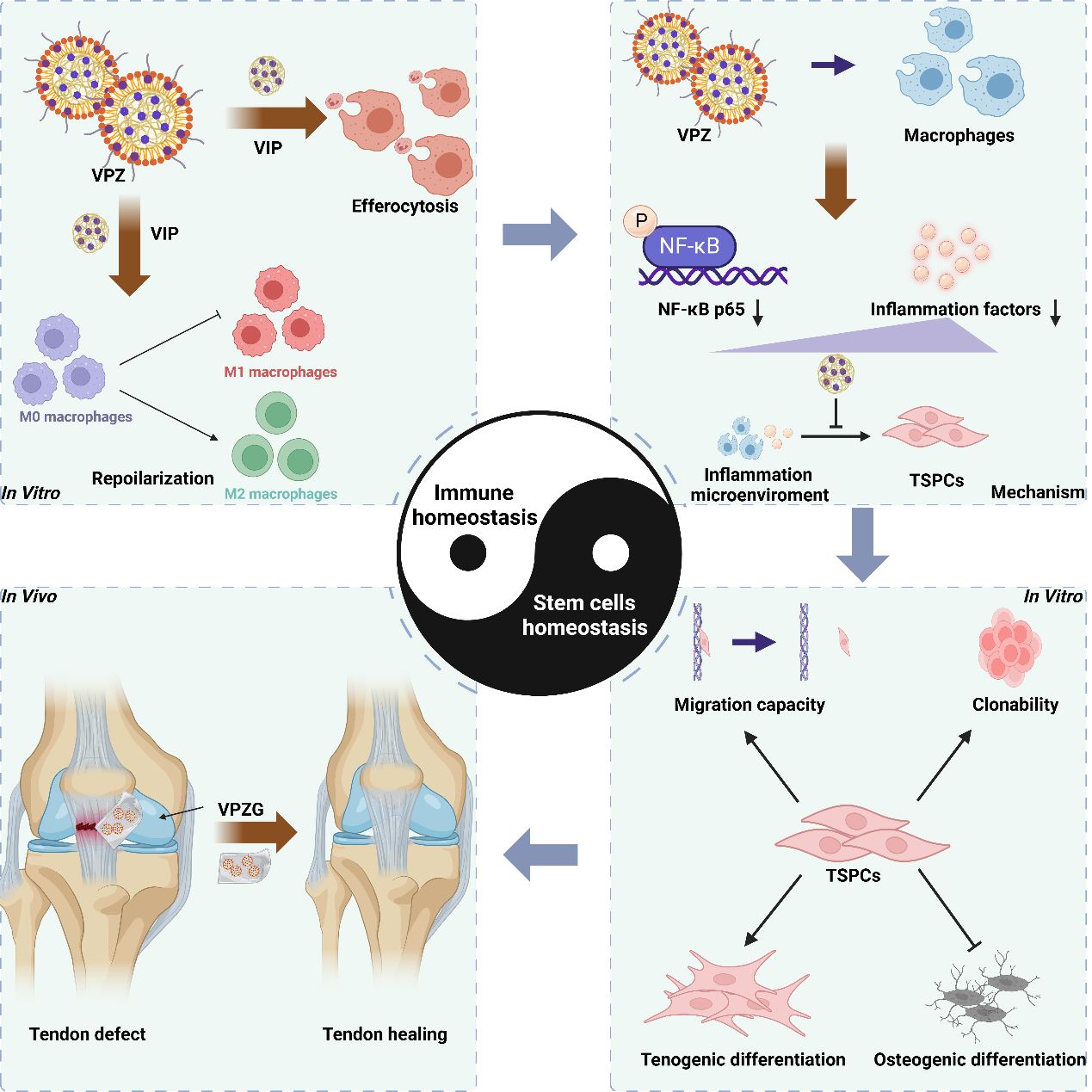 本研究建立一种新型生物材料VPZG(VIP@PLGA@ZIF-8@GelMa)并探究其在肌腱修复中的作用及其机制。研究团队通过将血管活性肠肽(VIP)负载于PLGA修饰ZIF-8纳米颗粒中,并嵌入GelMa水凝胶,实现了VIP在肌腱损伤部位的缓释。实验结果表明,VPZG能够促进巨噬细胞向M2型(抑炎)极化,抑制M1型(促炎)极化,并通过下调NF-κB信号通路减少炎症因子(如IL-1β、TNF-α)的释放,从而调节免疫微环境。此外,通过巨噬细胞-干细胞共培养发现,VPZG还增强了肌腱干细胞(Tendon stem/progenitor cells, TSPCs)的克隆形成、迁移和成腱分化能力。在SD大鼠髌腱损伤模型中,VPZG显著促进了肌腱再生,改善了胶原排列,并减少了炎症反应。这些发现表明,VPZG通过双重调控免疫稳态和干细胞功能,为肌腱损伤的临床治疗提供了新策略。研究还强调了VIP在组织修复中的广泛潜力,并展示了纳米材料在药物递送和再生医学中的应用前景。
