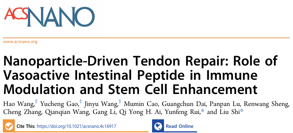 近日,艾弗森贝博ballbet官网外科学系石柳/芮云峰教授团队在国际权威学术期刊ACS Nano(《美国化学学会纳米杂志》,IF 15.8,中科院1区)在线发表原创性研究论文,题为“Nanoparticle-Driven Tendon Repair: the Role of Vasoactive Intestinal Peptide in Immune Modulation and Stem Cell Enhancement”,该研究聚焦负载血管活性肠肽纳米颗粒通过调节免疫稳态与干细胞功能促进肌腱内源性修复能力,提出肌腱损伤修复新策略。