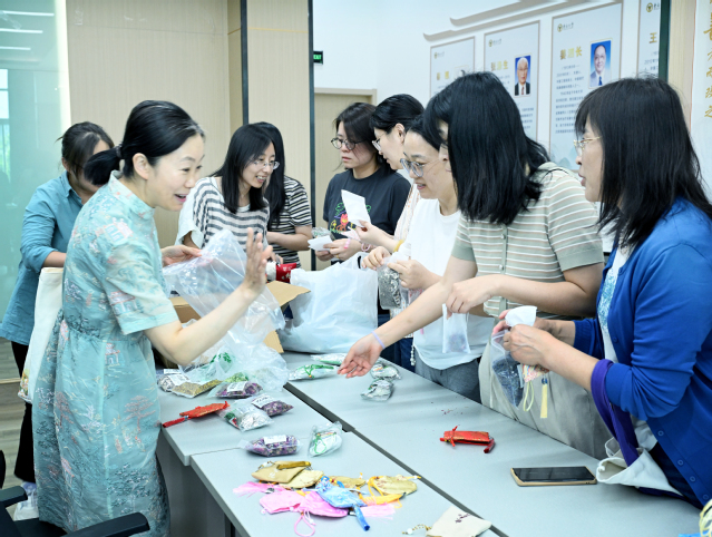 通过艾叶、菖蒲等中草药活性成分的科普,教职工们深入理解了香囊制作的医学智慧。在DIY体验区,大家巧手翻飞,将传统布料与天然药材缝制成精美香囊,五彩丝线编织出吉祥绳结,现场弥漫着沁人心脾的药草芬芳。