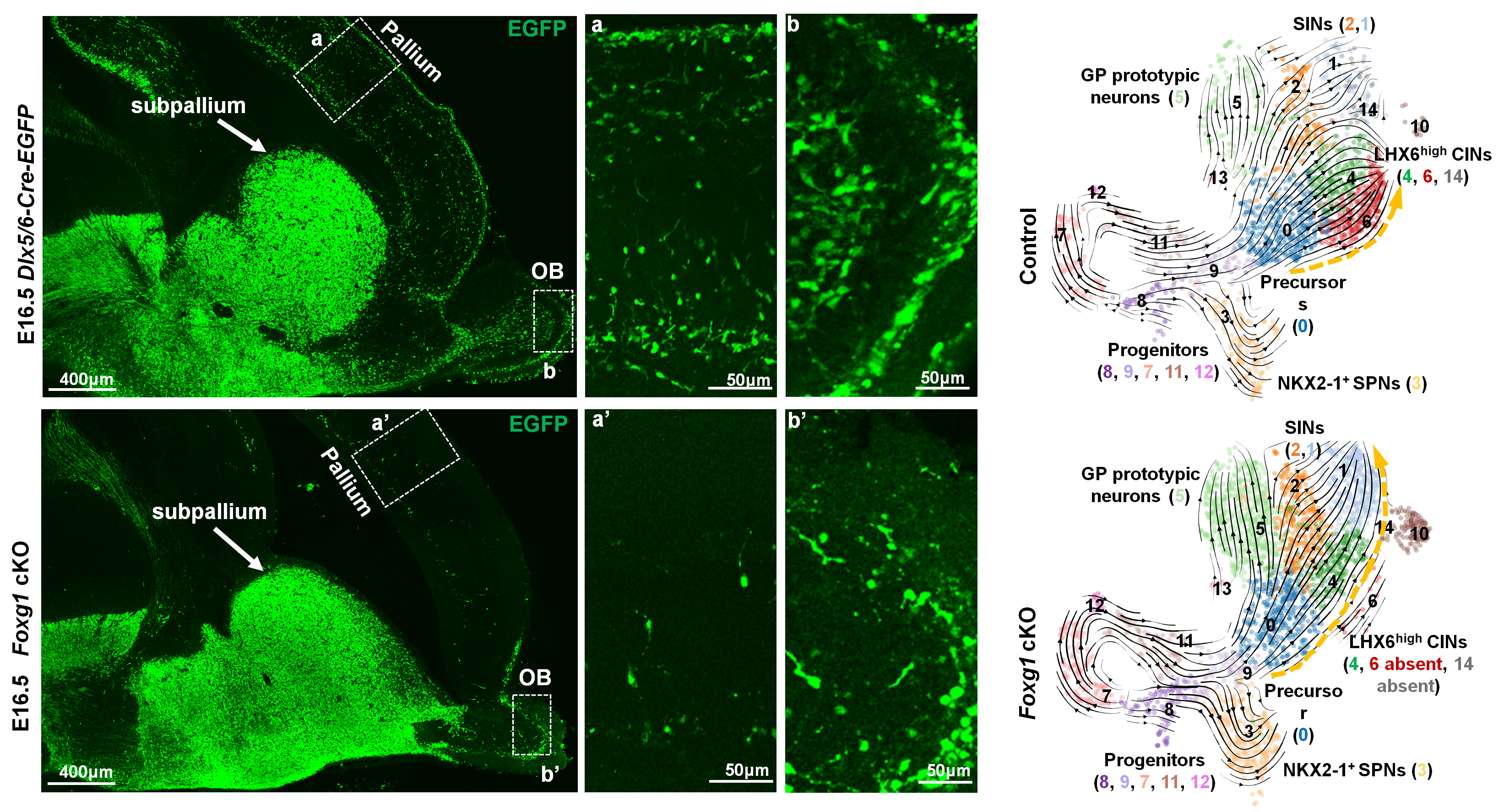 该研究首先通过Foxg1基因功能缺失结合scRNA-seq,发现缺失Foxg1导致内神经节隆起(MGE)产生的皮质LHX6high中间神经元倾向于获得皮质下区纹状体中间神经元和苍白球prototypic投射神经元的命运,而背外侧/尾侧神经节隆起(dLGE/CGE)起源的皮质PROX1high中间神经元和嗅球抑制性中间神经元倾向于获得皮质下球杏仁核GABA能神经元和苍白球arkypallidal投射神经元的命运。通过生物信息学手段解析了起源于MGEdLGE/CGE9GABA能神经元亚型的发育轨迹,鉴定了决定MGE谱系和dLGE/CGE谱系GABA能神经元命运抉择的关键调控因子,揭示了9GABA能神经元命运特化的调控机制。