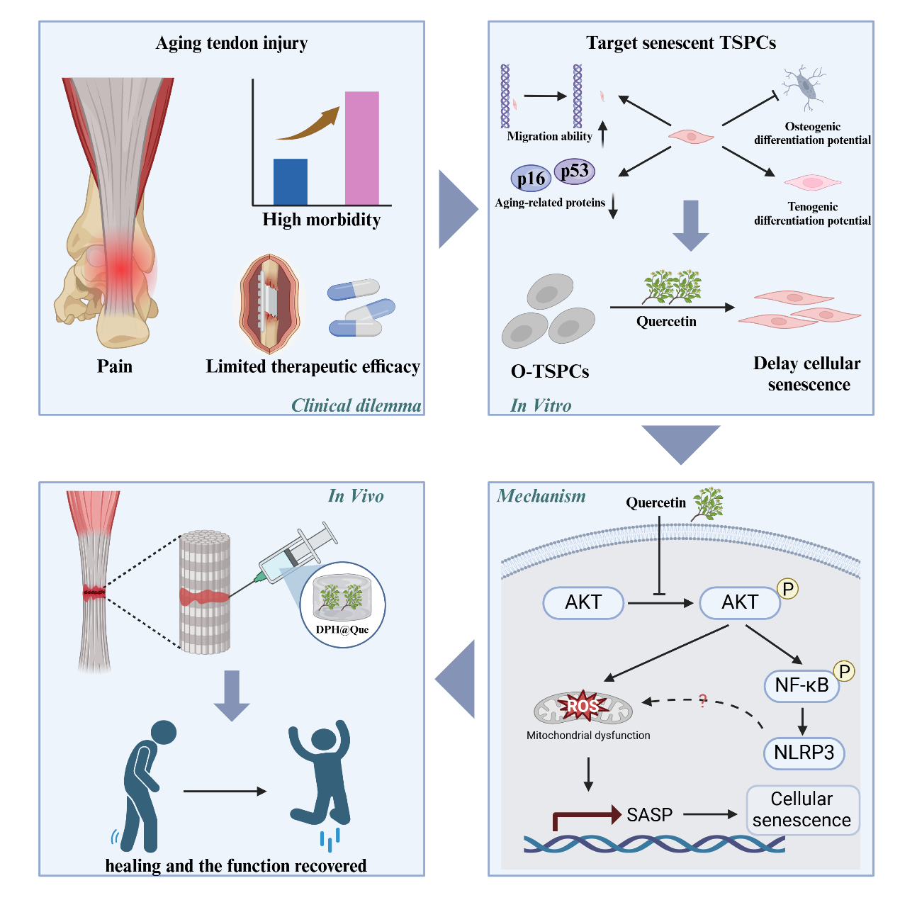 肌腱老化与肌腱干细胞(Tendon Stem/Progenitor Cells, TSPCs)衰老密切相关,其特征为增殖分化能力下降、线粒体功能障碍及衰老分泌表型(SASP)分泌增加等。槲皮素是一种广泛存在于植物中的天然类黄酮化合物,具有显著的抗氧化、抗炎等多种生物活性。研究证实槲皮素可通过AKT介导的线粒体稳态维持及抑制SASP过表达,有效缓解TSPCs的衰老表型。体内使用双多肽水凝胶DPH负载槲皮素注射至跟腱损伤部位以实现促进肌腱损伤修复的作用,为老龄化肌腱损伤提供了一种新型治疗策略。