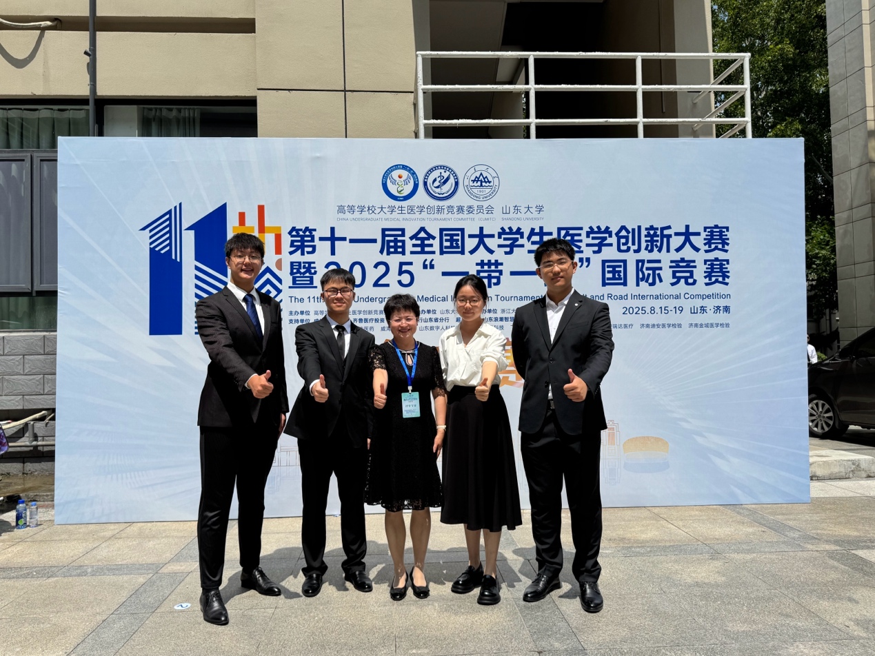 2025年8月15日-8月19日,第11届全国大学生医学创新大赛暨“一带一路”国际竞赛总决赛在山东大学圆满落幕。本次大赛由高等学校大学生医学创新竞赛委员会主办、山东大学等承办。比赛分为28个分赛场举行,来自10余个国家、201所高校的820余支队伍,4000余名师生、200余位嘉宾与评审专家参加活动,评审专家中半数以上为各类国家级人才。总决赛设金奖、银奖、铜奖和单项奖(最佳学术奖,最佳风采奖、最佳团队合作奖),并增设全国总冠军争夺战环节,本科院校各学科赛道各赛场的第1名进入终级角逐。采用赛前命题、借助AI工具等在现场进行创新设计、限时比赛模式,决出终极大奖:全国总冠军、亚军、季军及全国前十。