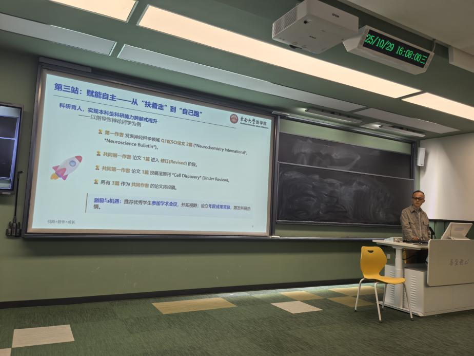 随后,药理学系贾彦鹏老师以“引导启蒙为本,因材施教育人”为核心分享工作心得。她强调建立平等、个性化的“学术伙伴”关系,从学生性格、兴趣、能力出发制定成长路径,充当学生成长蓝图的“设计师”与“资源连接器”;注重科研启蒙,带领学生接触学术前沿,通过指导项目、竞赛等激发科研兴趣,同时搭建沟通桥梁,以定期经验交流、学术研讨与即时在线沟通,倾听学生困惑、助力学生发展。
