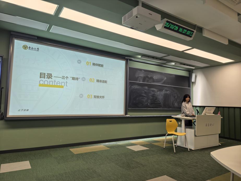 在“学生心中的好老师”分享环节,两位本科生结合自身经历与对理想导师的期待,从学生视角展开分享。23级本科生刘益佳以“亦师亦友,携手同行”为主题,围绕“三个期待”阐述与团队之间的相处模式:期待导师以“陪伴式引导”代替“甩手掌柜”,通过初次见面破冰、定期组会研讨、阶段化指导等方式保持密切联络;期待导师给予多元机会,支持学生尝试不同课题实验、参与丰富多彩的学术活动、旁听师兄师姐论文答辩,同时助力团队成员明确分工、发挥优势,构建温馨包容的共同体;更期待导师既是学术上的引路人,也是成长中的坚强后盾,在日常交流中给予关怀,关注学生考试与假期动态、提醒记录活动点滴,营造亦师亦友的良好氛围。