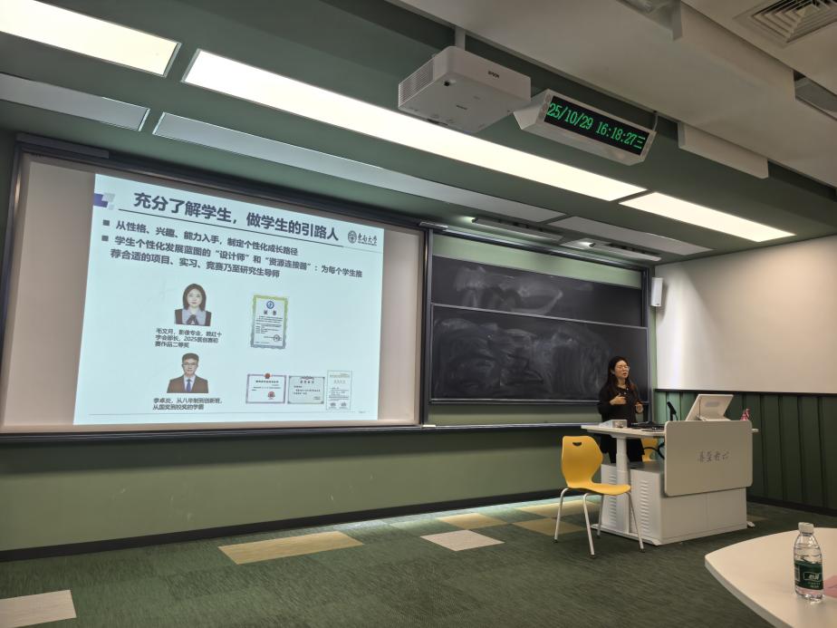 会议伊始,优秀导师代表依次分享育人实践与心得。生化学系穆明道老师以“引路·陪伴·成长”为主题,阐述其“亦师亦友导航员”的角色定位。核心围绕三大关键环节展开:在精准启蒙阶段,结合学生兴趣推荐前沿综述、带领阅读高水平论文,开放实验室依托SRTP项目让学生尽早接触真实科研课题;在全程陪伴阶段,于评奖评优、社会实践申报等关键节点提供信息支持,关注学生非学术成长,鼓励参与文体活动;在赋能自主阶段,推荐优秀学生参加学术会议、设立年度成果奖励,助力学生实现科研能力跨越式提升,培养自主科研素养。