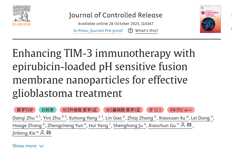 近日,艾弗森贝博ballbet官网谢金兵教授团队在国际权威学术期刊Journal of Controlled Release(影响因子11.5)在线发表题为 “Enhancing TIM-3 Immunotherapy with Epirubicin-Loaded pH-Sensitive Fusion Membrane Nanoparticles for Effective Glioblastoma Treatment”的研究论文。该研究构建了一种能够高效穿越血脑屏障并精准递送免疫药物的多功能仿生融合膜纳米体系,在胶质母细胞瘤(GBM)免疫治疗中取得了重要突破,为TIM-3免疫治疗提供了全新的思路。