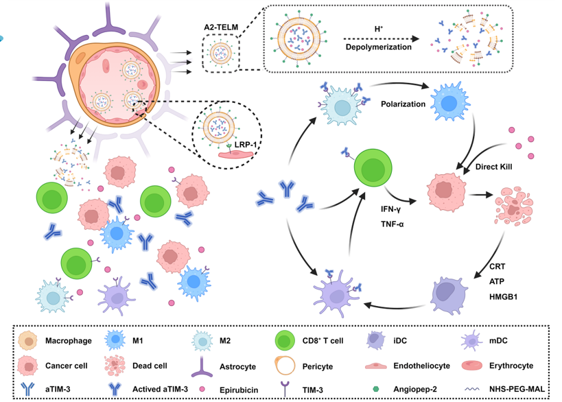胶质母细胞瘤是中枢神经系统最具侵袭性和致死性的肿瘤之一,其复杂的免疫抑制微环境及血脑屏障的双重限制,使传统免疫检查点治疗效果有限。TIM-3虽被认为是潜在免疫靶点,但因临床疗效不佳长期被视为“次优靶点”。针对这一难题,谢金兵团队提出“递送系统+免疫原性细胞死亡(ICD)诱导协同”的新策略,开发了pH敏感巨噬细胞膜融合纳米颗粒(A2-TELM),可同时递送抗TIM-3单抗与化疗药物表柔比星(EPI)。该体系通过Angiopep-2肽介导的受体转运高效跨越血脑屏障,实现药物在脑瘤组织的精准富集与酸性环境响应释放。