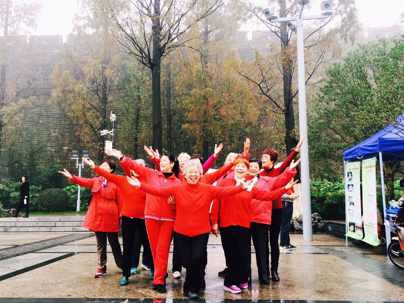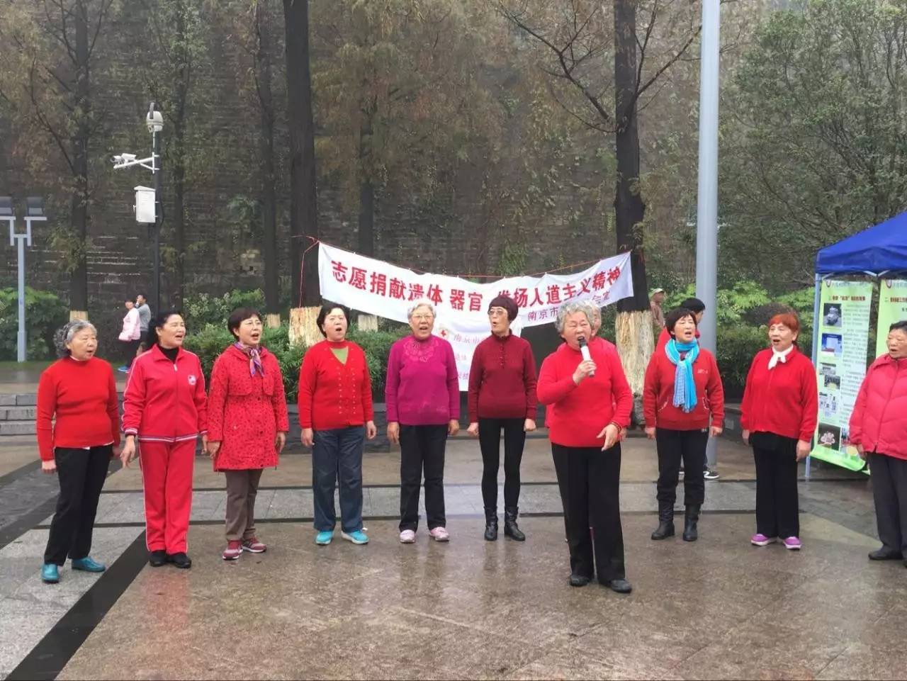 志友们都身着红色服装,很是喜庆 志友,是唱歌最动情的一群人
