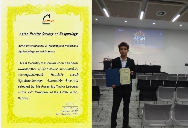 In November 23, 2017, Zewei Zhou, a doctoral student from medical school of Southeast University, was awarded the Assembly Award by the congress for his achievements in the field of silicosis research, at the 2017 APSR Congress held in Sydney, Australia.