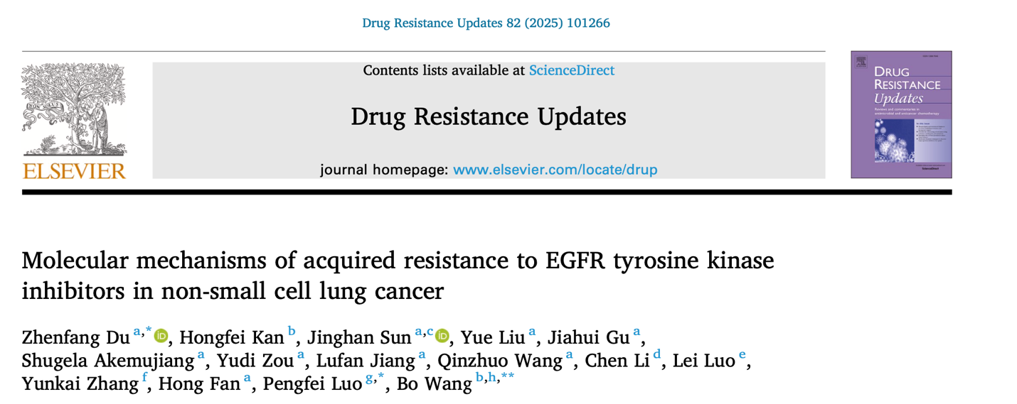 Dr. Zhenfang Du group’s review paper entitled “Molecular mechanisms of acquired resistance to EGFR tyrosine kinase inhibitors in non-small cell lung cancer” has been published onDrug Resistance Updates(IF=15.8), a prestigious academic journal in biomedical field. This review comprehensively summarizes the recent progress on the identification and understanding of the acquired resistance mechanisms to EGFR tyrosine kinase inhibitors (TKIs) in patients with non-small cell lung cancer (NSCLC). The work also discussed the potential strategies to delay or overcome the acquired resistance.