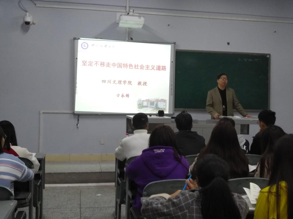 2018年11月12日晚,学校校长、四川省有突出贡献的优秀专家刁永锋教授在一教楼208教室为财经管理学院2017级1、2、8班同学讲授题为“坚定不移走中国特色社会主义道路”的形势与政策课。财经管理学院党总支副书记(主持工作)李兴贵老师、beat365正版唯一官网必一形势与政策教研室主任梁云老师、辅导员魏晓军老师一同聆听了刁校长的授课。