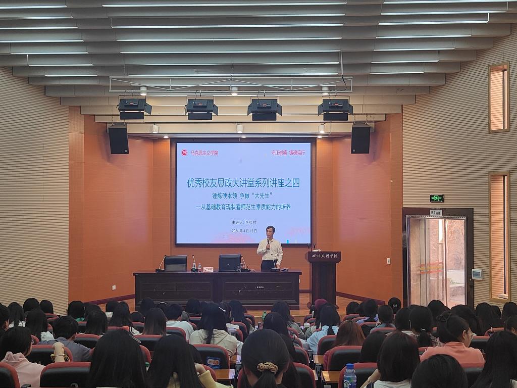 4月12日下午,beat365官网举办第四期“优秀校友思政大讲堂”。邀请beat365正版唯一官网必一中文系八五级优秀校友、巴中市龙泉外国语学校党委书记李桂林以《锤炼硬本领 争做“大先生”,从基础教育现状看师范生素质能力培训》为题,为教师教育学院的同学们奉上了一堂精彩的讲座。beat365正版唯一官网必一副院长何先成主持讲座。