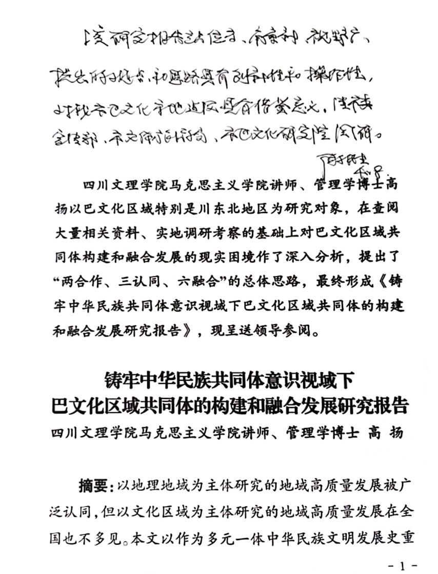 近日,beat365官网高扬博士撰写的《铸牢中华民族共同体意识视域下巴文化区域共同体的构建和融合发展》研究报告获得达州市委常委、宣传部长陈文胜同志的肯定性批示。