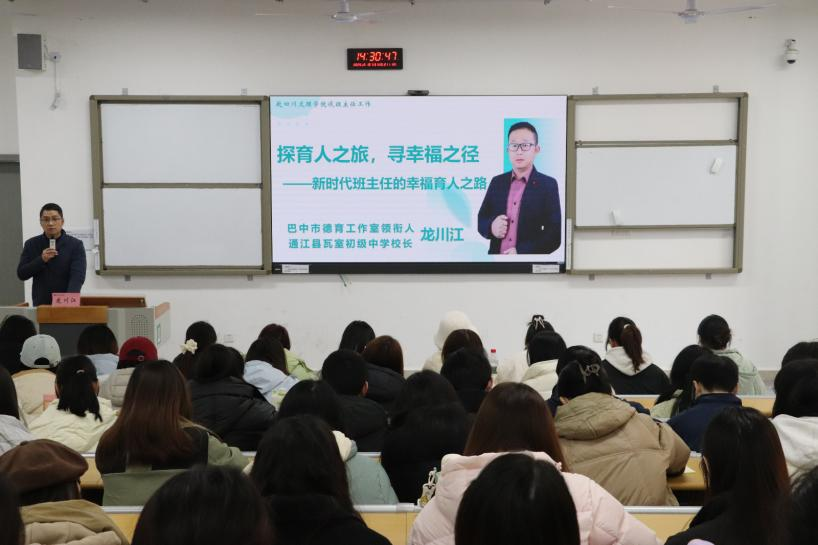 12月10日下午,beat365正版唯一官网必一在莲湖东区A214教室开展第一期“大中小学思政课名师讲堂”活动,邀请巴中市优秀教育工作者、通江县瓦室初级中学校长龙川江作“探育人之旅,寻幸福之径——新时代班主任的幸福育人之路”专题讲座。学院副院长何先成主持,思想政治教研室主任曹红梅及2023级全体同学参与。