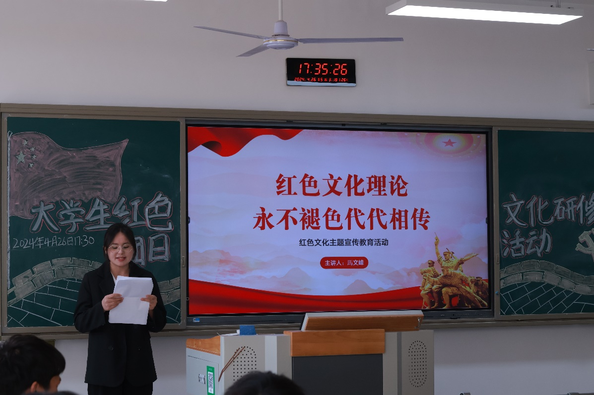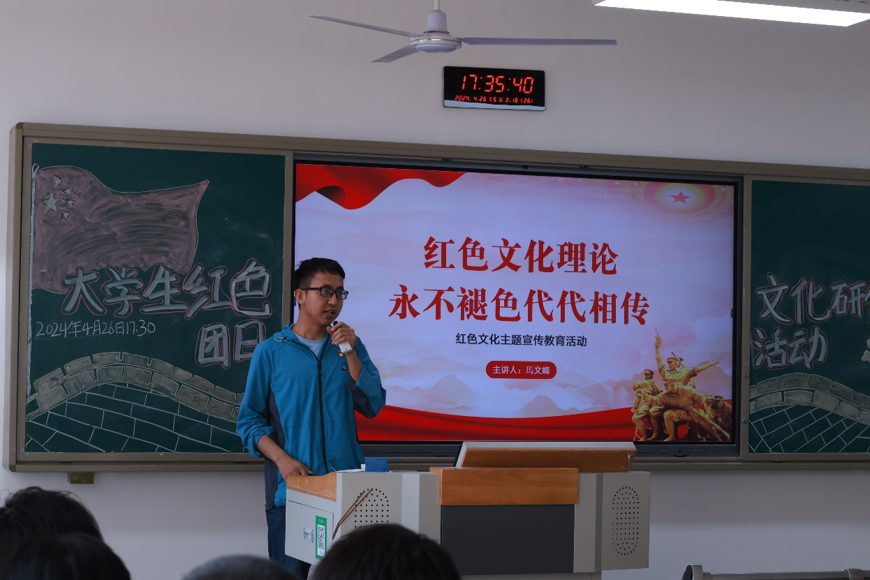 颁奖过后,社长马文峰为同学们作红色文化主题宣传教育。马文峰以红色文化为核心,深入讲解了红色文化的理论价值与实践意义,进一步分析了红色文化的时空架构与红色文化的内涵要义。他还指出:红色文化是中国人民在中国共产党领导的长期革命实践过程中,不断选择、融合、创造所形成的优秀文化,是蕴含着革命先辈无穷智慧的精神财富,我们社团扎根达州红色沃土,更应厚植爱国主义精神,深度研究红色川陕苏区红色文化,传承红色血脉。