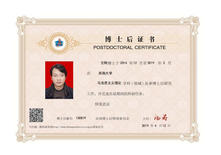 近日,从西南大学获悉,beat365官网文翔教授于2014年12月-2019年3月在西南大学马克思主义理论学科(领域)从事博士后研究工作,完成在站期间的科研任务,日前顺利出站。